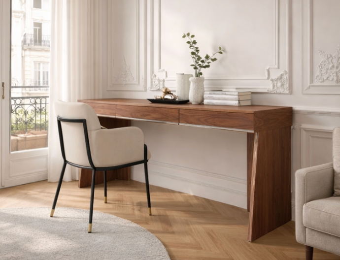 Sa structure en bois plaqué noyer naturel séduit par ses lignes nettes et équilibrées, tandis que les détails en acier inoxydable chromé apportent une touche sophistiquée et moderne. Doté de trois tiroirs intégrés à fermeture amortie, ce bureau offre un rangement pratique et discret, idéal pour maintenir un environnement de travail ordonné et harmonieux, aussi bien dans un bureau professionnel que dans un intérieur résidentiel.